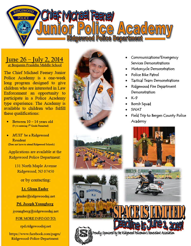 The Ridgewood Police Department will be hosting the Chief Michael Feeney Jr.Police Academy June 26th through July 2nd 2014. The Academy is open to Ridgewood residents ages 10 to 14. Applications are available at the Riddgewood Police desk 131 North Maple Ave.