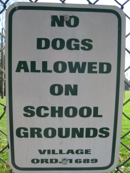 Village Ordinance #1689 is the Village’s “pooper scooper” law. It does not ban dogs from school grounds, regardless of what these signs indicate.