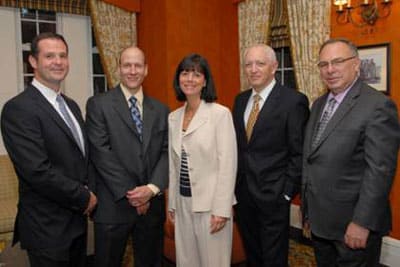 From left: Gynecologic-Oncologist William Burke, M.D.; Robert Silverman, M.D., Co-Medical Director, The Valley Institute for Pain; Audrey Meyers, President and CEO, The Valley Hospital and Valley Health System; Alexander Zapolanski, M.D., Director of Cardiac Surgery, The Valley Hospital; and Joseph Pizzurro, M.D., Director of Orthopedic Surgery, The Valley Hospital.