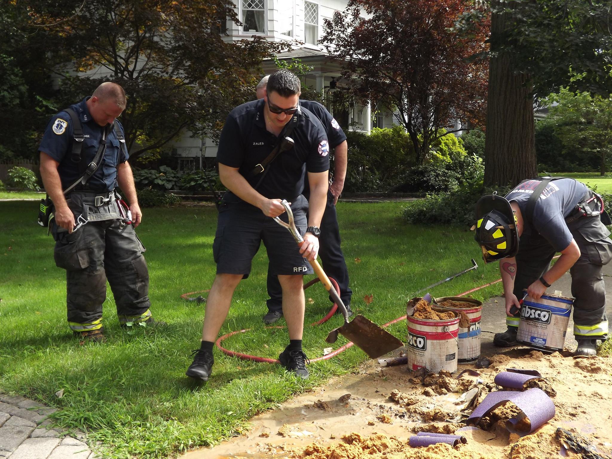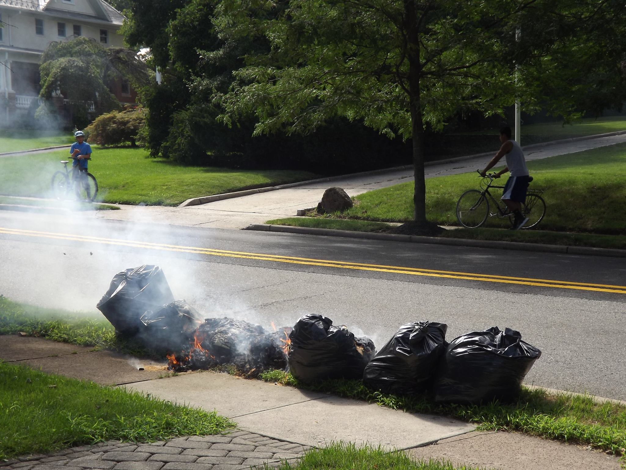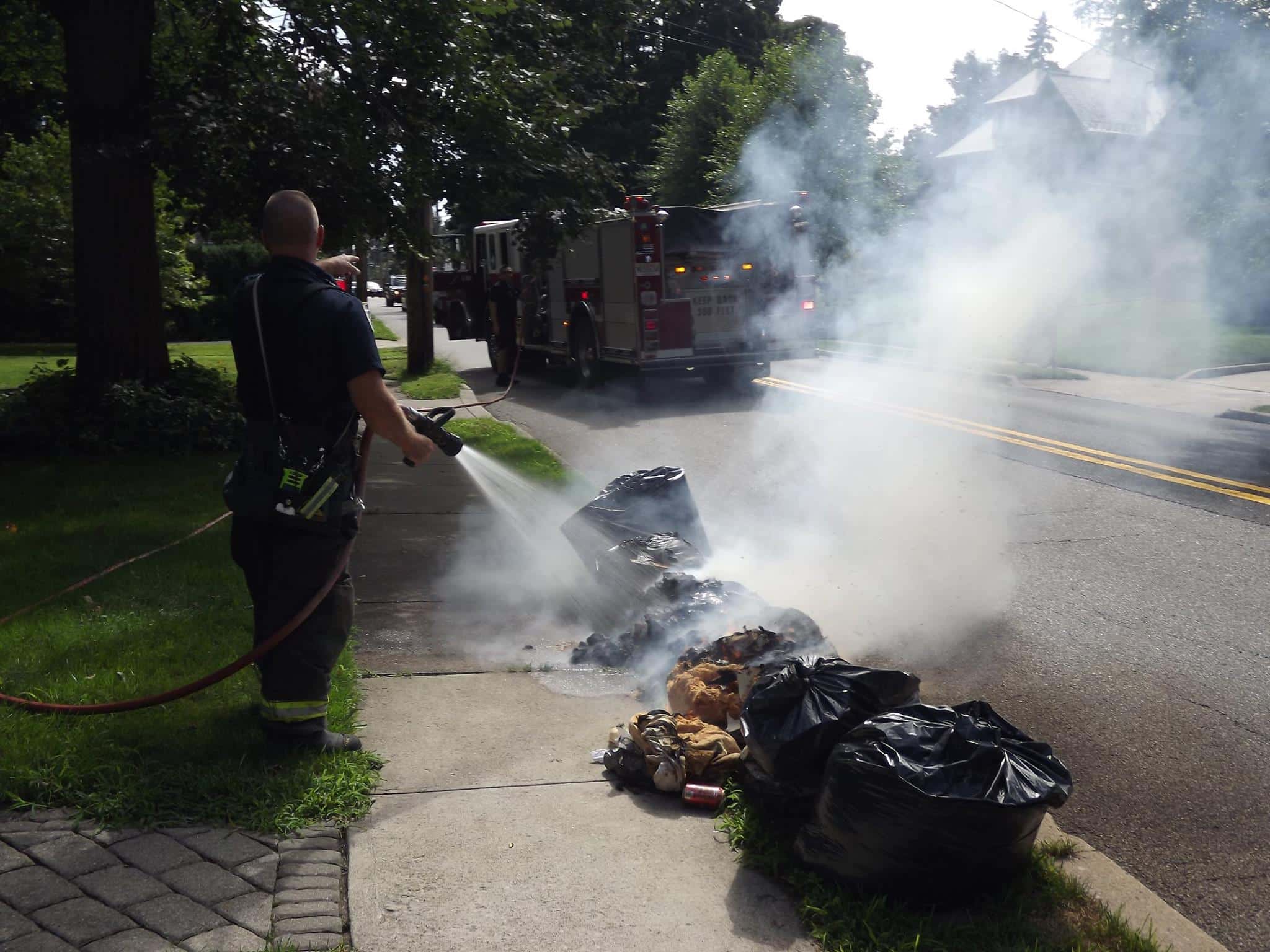Ridgewood NJ, Discarded waste associated with the sanding of hardwood floors ignited unexpectedly after being placed at the curb in large plastic trash bags for pickup in front of 347 South Maple Avenue, Ridgewood on the afternoon of Wednesday, 08/17. The crew from Ridgewood Engine Company #35 extinguished the small blaze using the apparatus’ booster line and hosed down all other debris left at the curb to avoid a repeat incident. Ridgewood PD provided traffic control while firefighters worked.