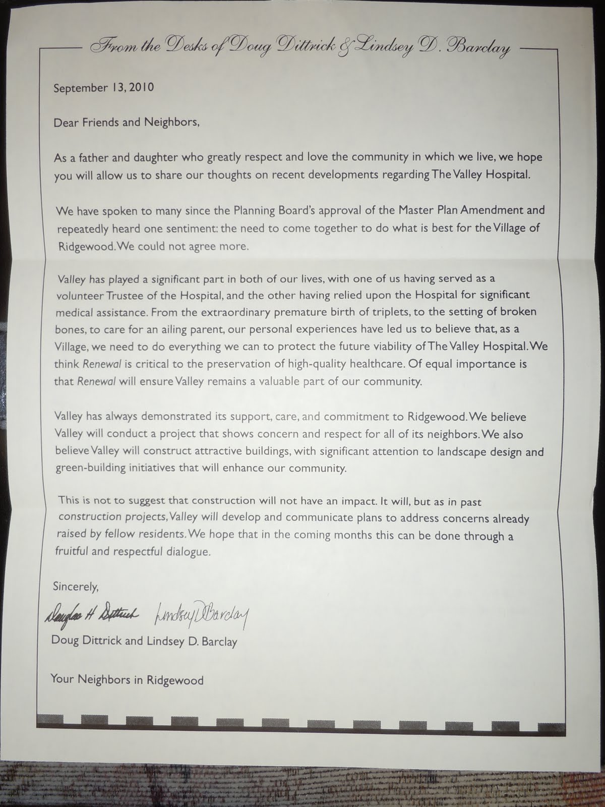 Many of you have read the letter in support of Valley Hospital that was sent to Village residents from Lindsay Barclay and her father Doug Dittrick? Dated on September 13th .